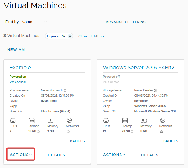 **Step 3.** Find the Virtual Machine and click on 'Actions'