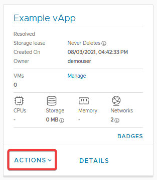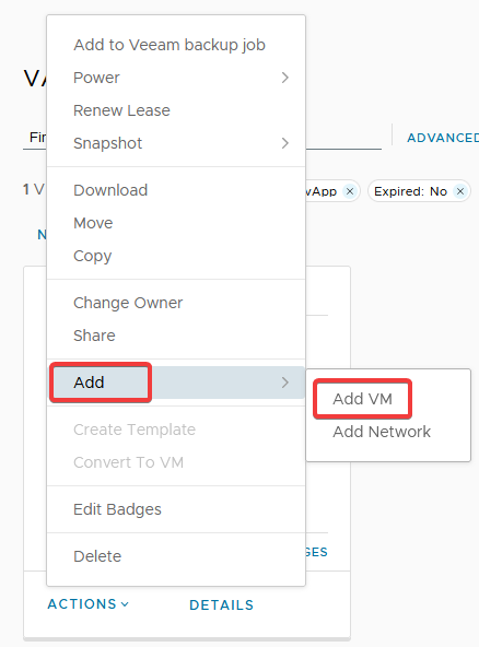 **Step 4.** Find the vApp you want to add a VM to and click 'Actions'