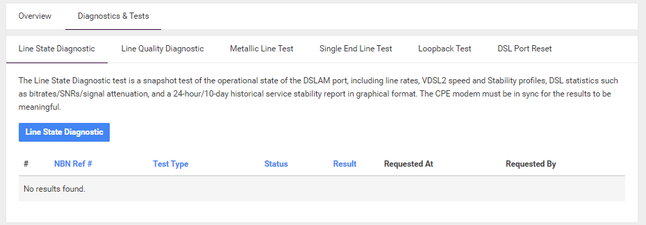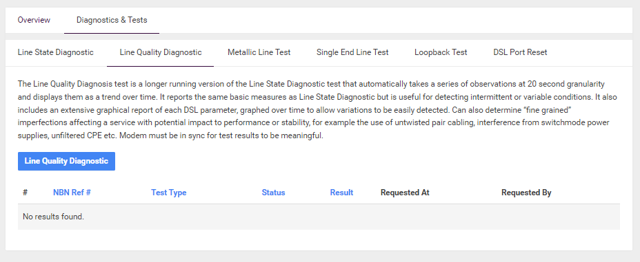 <table><thead><tr><th width="150">Test</th><th width="150">Service Type/s</th><th width="150">Requirements</th><th width="317.1538461538462">Description</th></tr></thead><tbody><tr><td>Loopback Test</td><td>FTTP, FTTB, FTTN, FTTC, HFC</td><td>Service Impacting</td><td>Sends small amount of data between us and you (and back again) to test that data is getting through in both directions.</td></tr><tr><td>Line State</td><td>FTTB, FTTN</td><td>Service Impacting</td><td>The Line State test is a snapshot test of the operational state of the DSLAM port, including line rates, VDSL2 speed and Stability profiles, DSL statistics such as bitrates/SNRs/signal attenuation, and a 24-hour/10-day historical service stability report in graphical format. The CPE modem must be in sync for the results to be meaningful.</td></tr><tr><td>Line Quality Diagnostic</td><td>FTTB, FTTN</td><td>Non Service Impacting</td><td>The Line Quality Diagnosis test is a longer running version of the Line State test that automatically takes a series of observations at 20 second granularity and displays them as a trend over time. It reports the same basic measures as Line State but is useful for detecting intermittent or variable conditions. It also includes an extensive graphical report of each DSL parameter, graphed over time to allow variations to be easily detected. Can also determine “fine grained” imperfections affecting a service with potential impact to performance or stability, for example the use of untwisted pair cabling, interference from switch mode power supplies, unfiltered CPE etc. Modem must be in sync for test results to be meaningful.</td></tr><tr><td>Single End Line Test</td><td>FTTB, FTTN</td><td>Service Impacting</td><td>Long-running test of copper line from one end only. This test that can detect relatively “coarse grained” line conditions such as breaks (open circuit condition) and bridge taps which can cause performance degradation. It will also quantify line bitrate capacity which can be used as a speed profile upgrade predictor. It must be run with all CPE physically disconnected from the line for the results to be accurate and meaningful.</td></tr><tr><td>DSL Port Reset</td><td>FTTB, FTTN</td><td>Service Impacting</td><td>Forces a lock/unlock of the NBN DSLAM port. Identifies if the modem is connected to correct port (dataflow issues). Resets to original settings</td></tr><tr><td>Metallic Line Test</td><td>FTTN, FTTP (if using UNI-V port)</td><td>Service Impacting</td><td>MLT (metallic line test) runs a DC electrical test from the DSLAM port towards the Premises. A range of tests to assess passive copper electrical characteristics including any CPE connected at the time</td></tr><tr><td>NCD UNI-D Status</td><td>FTTC</td><td>Non Service Impacting</td><td>Check the current operational status of the UNI-D port. If the NCD UNI-D port is operationally up and there is still no data, perform a 'NCD Port Reset'. Wait for 2 minutes and retest.</td></tr><tr><td>NCD Reset</td><td>FTTC</td><td>Service Impacting</td><td>Forced reset and then resynchronise the NCD</td></tr><tr><td>NCD Port Reset</td><td>FTTC</td><td>Service Impacting</td><td>Forces a lock/unlock of the port to allow the modem to attempt a reconnection. May resolve some dataflow issues</td></tr><tr><td>DPU Status</td><td>FTTC</td><td>Non Service Impacting</td><td>Checks that the equipment in the pit outside your property is online.</td></tr><tr><td>DPU Port Status</td><td>FTTC</td><td>Non Service Impacting</td><td>Checks that the Port on equipment in the pit outside your property is receiving power from your nbn™ Box. Also shows the connected data rate.</td></tr><tr><td>DPU Port Reset</td><td>FTTC</td><td>Service Impacting</td><td>Resets the port on the equipment in the pit that your nbn™ Box connects to.</td></tr><tr><td>NTD Status</td><td>FTTP, HFC</td><td>Non Service Impacting</td><td>Perform an NTD Status test. If the NTD Status test Fails, ensure that the NTD is powered on and repeat Basic Troubleshooting.</td></tr><tr><td>NTD Reset</td><td>HFC</td><td>Service Impacting</td><td>Resets the NTD and then checks NTD Status</td></tr><tr><td>UNI-D Status</td><td>FTTP</td><td>Non Service Impacting</td><td>Check the current operational status of the UNI-D port. If the NCD UNI-D port is operationally up and there is still no data, perform a “Port Reset’. Wait for 2 minutes and retest.</td></tr><tr><td>Port Reset</td><td>FTTP</td><td>Service Impacting</td><td>Forces a lock/unlock of the port. Identifies if the modem is connected to correct port (dataflow issues)</td></tr></tbody></table>